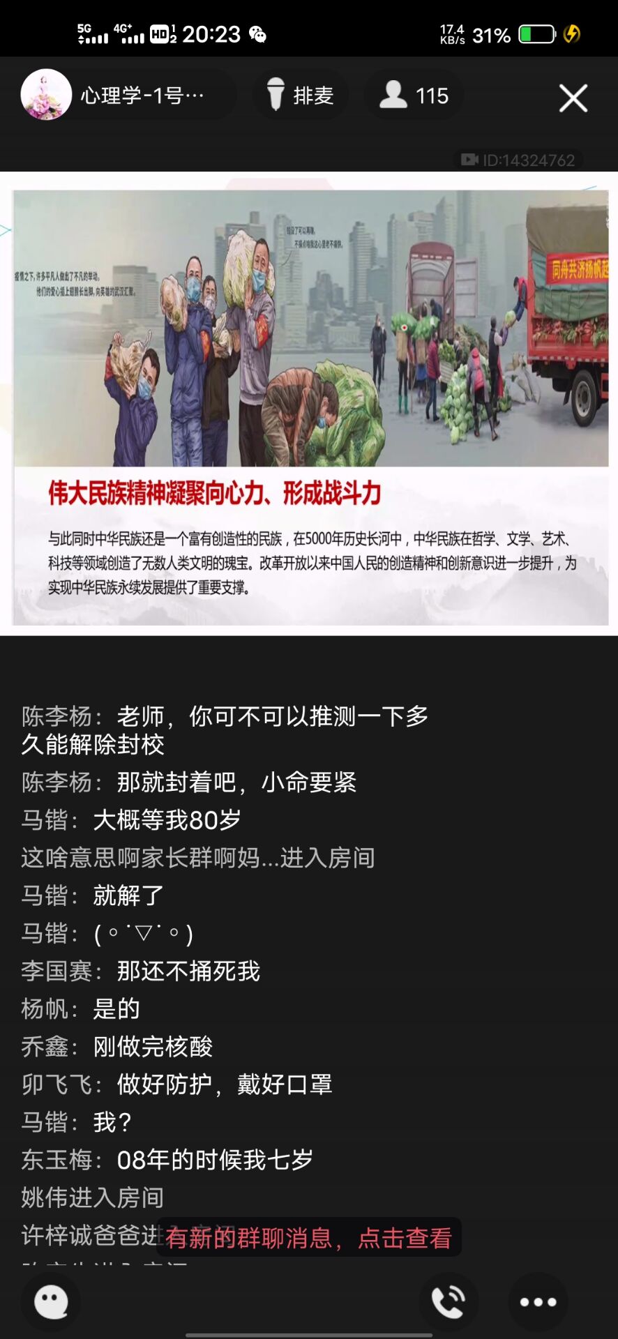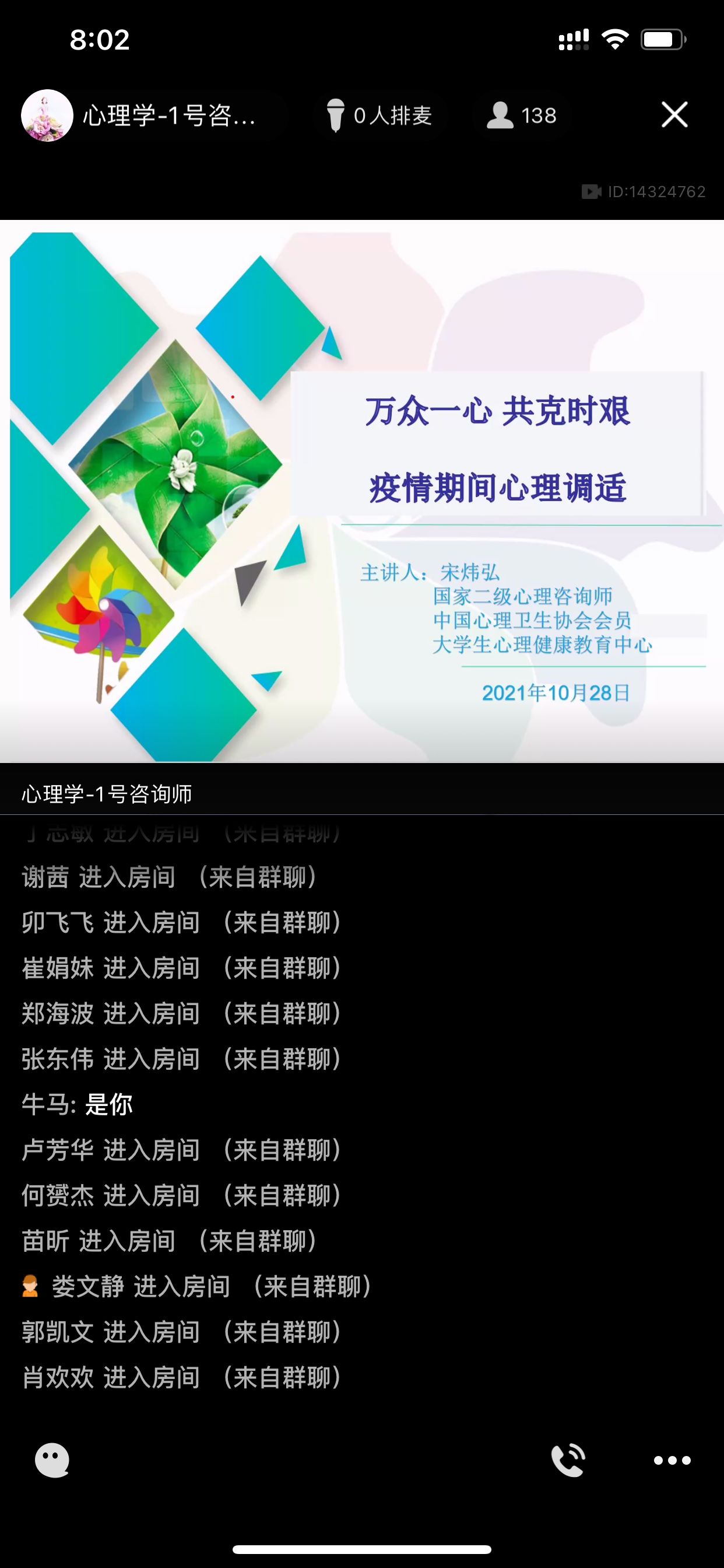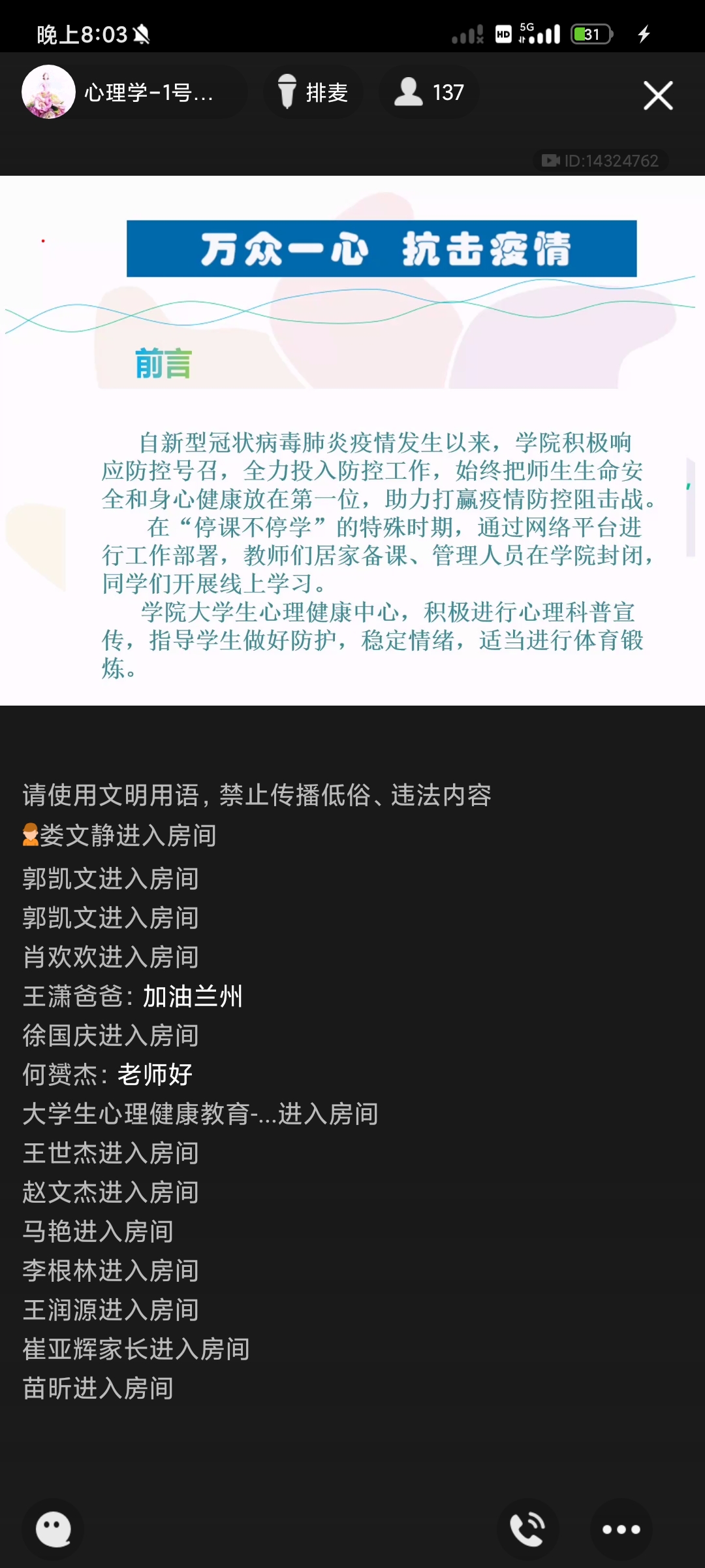 另外,根据学院疫情防控期间师生心理咨询与辅导方案,在学院和班级范围内开展了线上主题讲座。主题有《万众一心 共克时艰--疫情期间心理调适》《疫情再次来袭 如何科学做好心理防护》《“后疫情时代”的选择与梦想》等。并以宿舍人际关系、线上学习要求、情绪调节方法等专题,召开线上主题班会,对学生开展适度的心理辅导与思想教育工作。