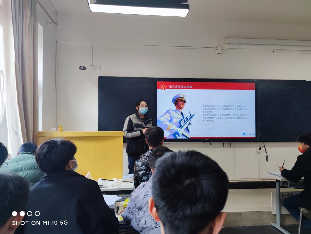 甘肃建筑职业技术学院始终坚持大学生应征入伍“数量有增长,质量有提高”的工作目标,为将2022年春季征兵工作做实、做细,学院在征兵工作原有制作宣传彩页、宣传横幅、宣传展板以及“五个一”工程(即举办一次征兵优惠政策咨询活动、一次优秀大学生士兵典型报告会、每个系开展一次政策巡回宣讲活动、每个班级开展一次大学生应征入伍主题班会、各辅导员给每位学生发一条征兵信息短信)的基础上,还成立了2022年春季征兵宣传小组,小组成员由退役复学学生组成,小组在学生工作处征兵办公室的指导下开展活动。2022年春季征兵工作启动以后,征兵宣传小组成员逐班进行了政策宣讲、疑问解答、参军积极分子造册登记等工作,在精准掌握参军积极分子后,由征兵办公室指导学生完成参军报名、手续办理、体检政审等相关流程。