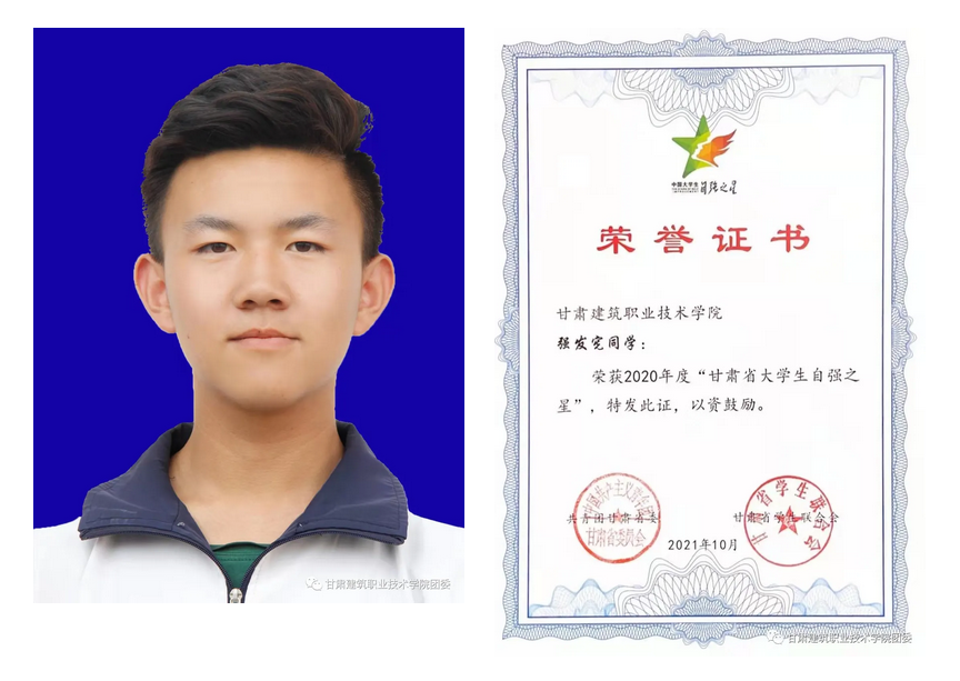 强发宪,男,汉,2000年7月生,中共预备党员,现就读于甘肃建筑职业技术学院建筑系19级视觉传播设计与制作专业。在校期间荣获2021年度国家奖学金、2020年度中国大学生自强之星奖学金、2020年度甘肃金兰创新创业奖学金、第13届挑战杯甘肃省大学生课外学术科技作品竞赛一等奖、第12届挑战杯甘肃省大学生创业计划竞赛铜奖、2021年甘肃省技能大赛原创插画设计赛项三等奖、2020年中华人民共和国第一届职业技能大赛甘肃选拔赛平面设计赛项优秀奖、2020年度甘肃省大学生自强之星。