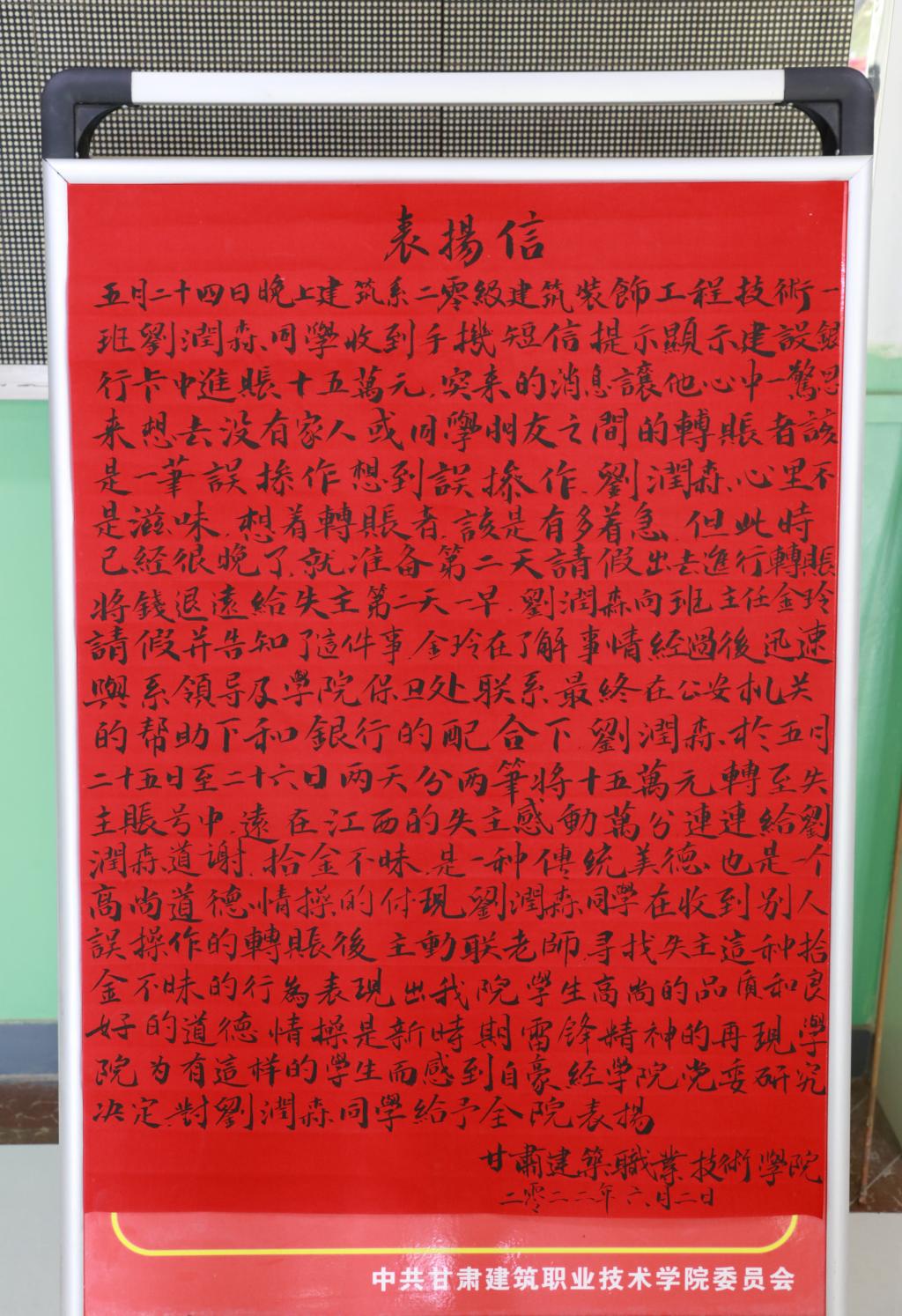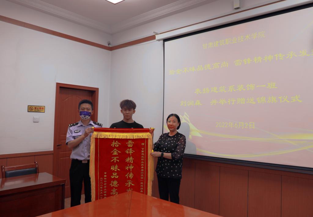 6月2日,甘肃建筑职业技术学院党委书记、院长王娟丽和相关部门负责人表扬了建筑系建筑装饰工程技术一班刘润森同学拾金不昧的行为,并举行了锦旗赠送仪式和颁发表扬信。七里河公安分局晏家坪派出所警官姚常伟、杨伟,学生刘润森参加了仪式。建筑系党总支书记蔡萍主持。