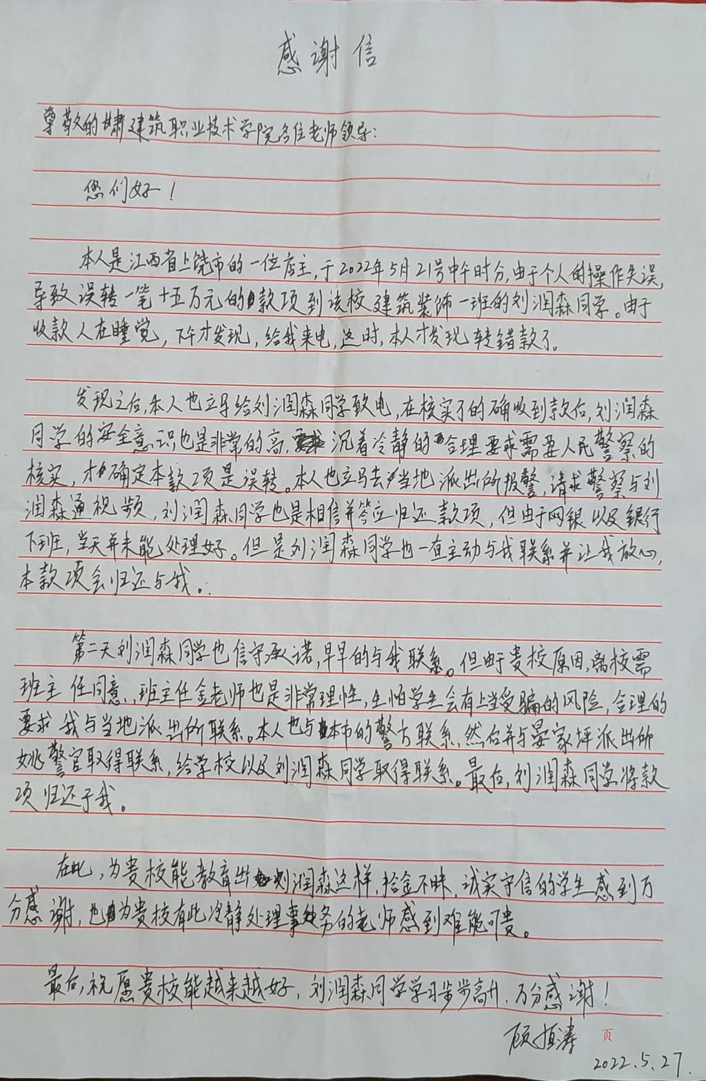 第二天一早,刘润森向班主任金玲请假并告知了这件事,金玲在了解事情经过后,迅速与系领导及学院保卫处联系。最终在公安机关的帮助和银行的配合下,于5月25日至26日两天分两次将15万元转至失主账号中,远在江西的失主感动万分,连连向刘润森道谢,并寄来了一封感谢信。
