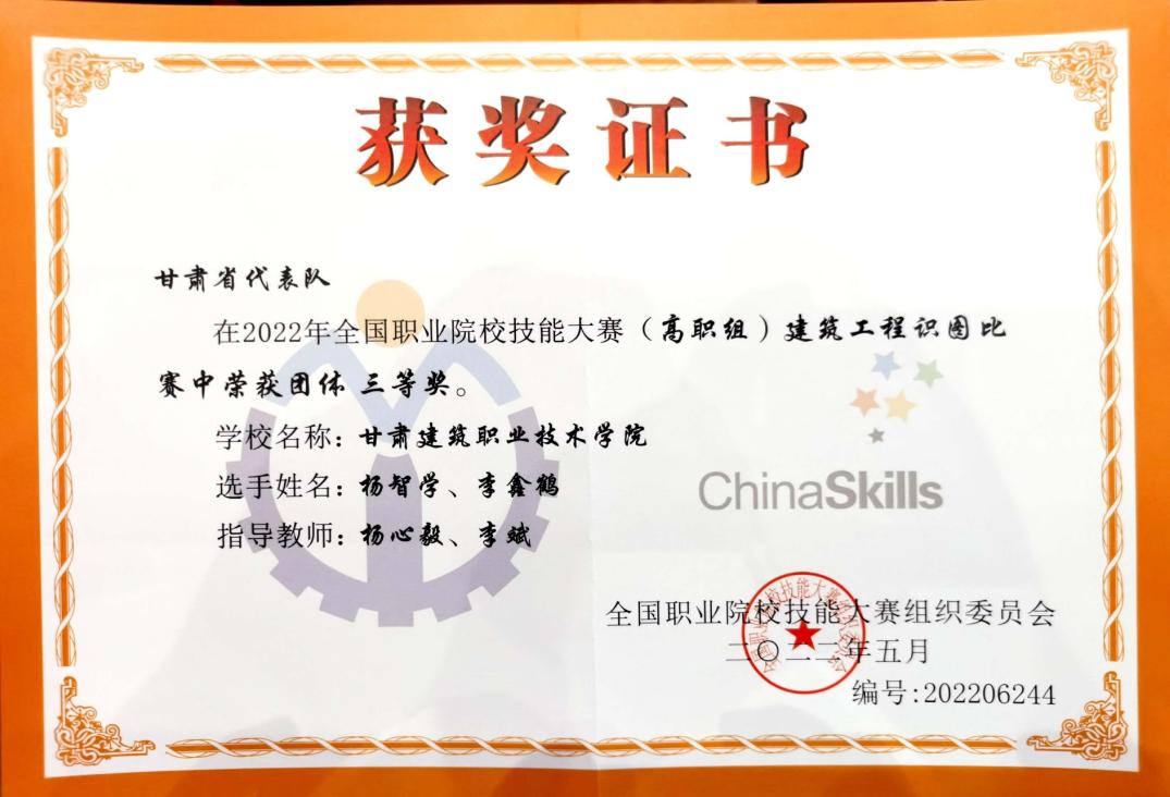 8月24日至25日,我院建筑工程系师生参加了由教育部牵头,山东省教育厅承办的2022年全国职业院校技能大赛,并在高职组“建筑工程识图”赛项中获得三等奖。本次大赛共有来自全国31个省、58所高职院校、近300名师生齐聚济南工程职业技术学院。由我院建筑工程系杨心毅和李斌作为指导老师,2020级学生杨智学、李鑫鹤组成的团队作为甘肃省代表队参赛,经过10个小时的现场奋力作战,以团体总分第二十七名的成绩荣获三等奖,实现该项赛事成绩新突破。备赛期间,学院领导亲切慰问,鼓励团队提高训练效果,展现建院学子风采,力争国赛成绩突破。学院各部门协调合作,从人力、物力、财力等方面为团队师生提供了全方位的帮助。建筑工程系党总支和系领导高度重视,对大赛训练统一部署,师生放弃节假日、克服疫情影响和重重困难,制定了科学、系统的辅导方案,对参赛选手进行了长达半年的训练辅导。竞赛结果体现了我系人才培养模式取得的显著成效,也为我院继续加强专业建设与改革,不断提高人才培养质量奠定了坚实基础。