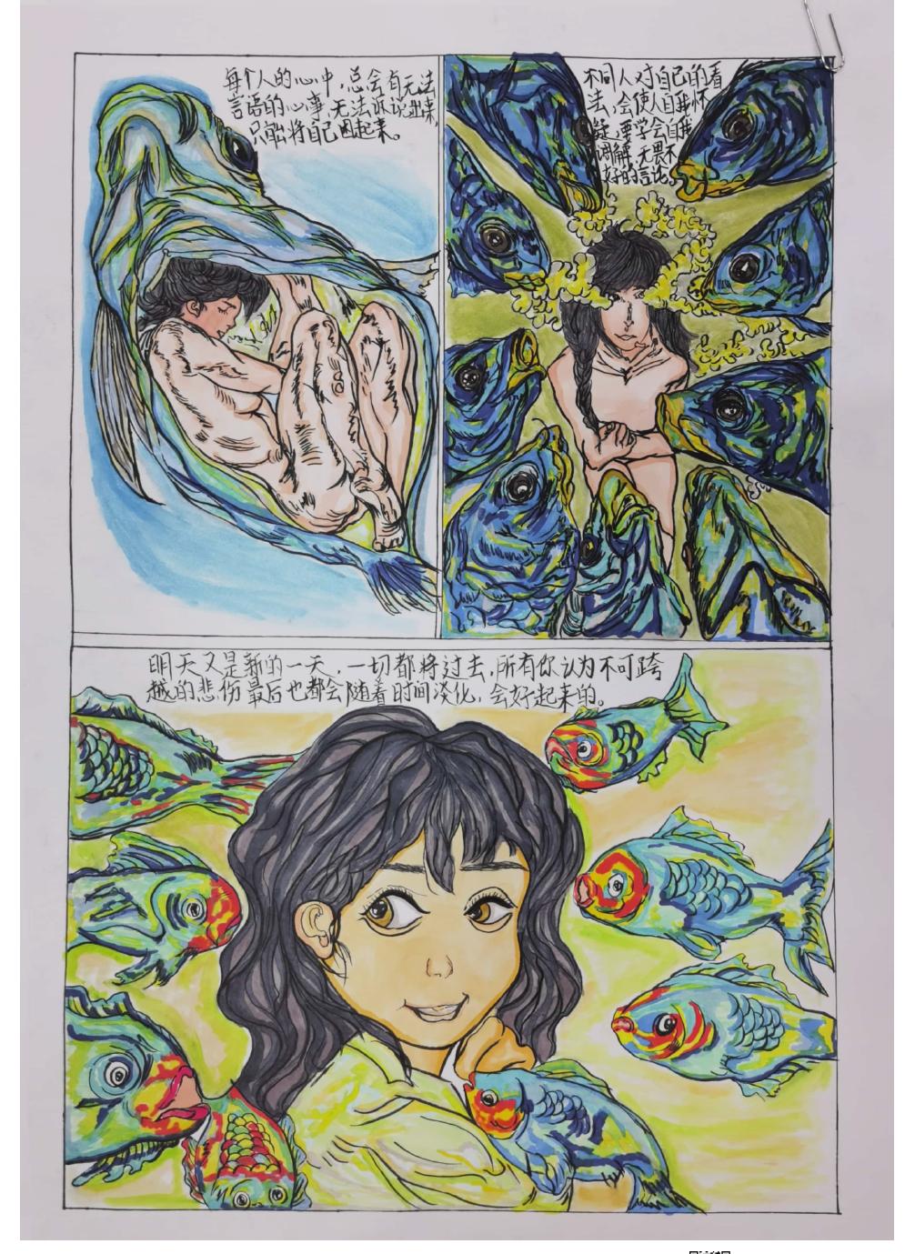 心理漫画是运用比喻、夸张、写实、象征、投射等手法,通过漫画将心理活动、体验及内心感悟表达出来的一种艺术形式。此次心理漫画大赛收集了各系经过初选,推荐的优秀作品56份,同学们分别用不同的形式表现内心世界,作品描绘青春的颜色、展现海水般的忧郁、深海中温暖的阳光、不断治愈前行的身影、和另一个自己的对话、向阳而生的花季少女、向下扎根向上成长的心脏……