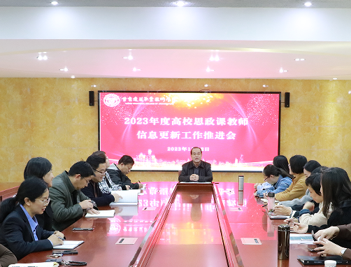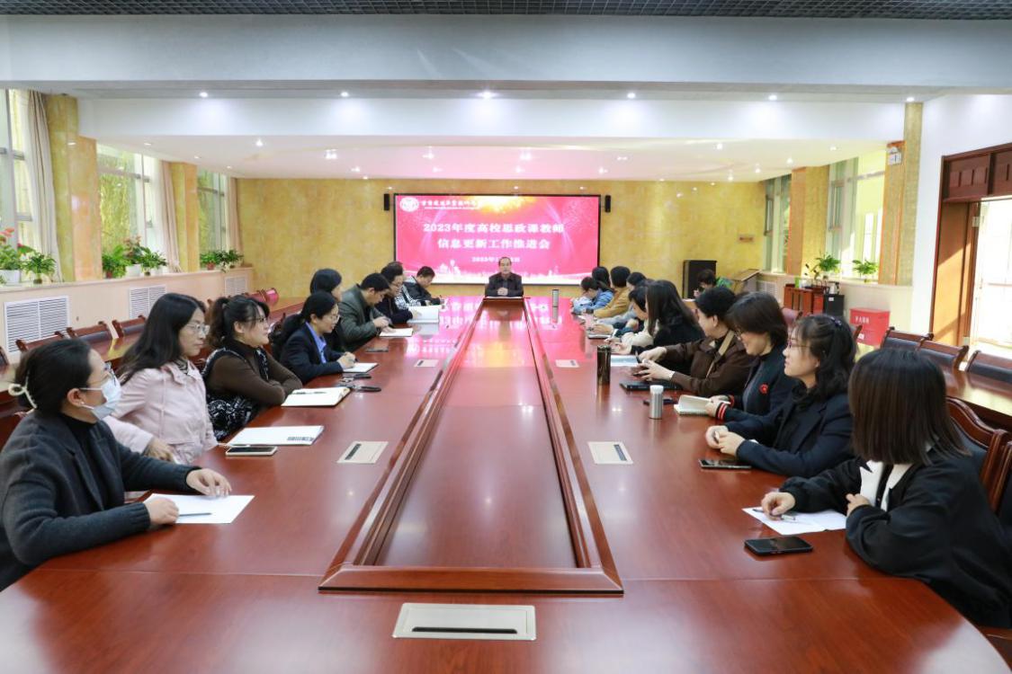 为深入贯彻落实习近平新时代中国特色社会主义思想和党的二十大精神,特别是习近平总书记关于思政课建设的系列重要讲话精神,根据中办、国办《关于深化新时代学校思想政治理论课改革创新的若干意见》《关于加强新时代马克思主义学院建设的意见》,以及教育部《新时代高等学校思想政治理论课教师队伍建设规定》《普通高等学校马克思主义学院建设标准(2023年版)》等文件要求,进一步提高思政课教师队伍精准化管理水平,为教育部开展思政课教师队伍培训、思政课教学展示、项目申报以及听课调研等重点工作提供决策、实施依据,马克思主义学院于11月2日下午,在新会议室召开2023年度高校思政课教师信息更新工作推进会暨教学工作会。甘肃建筑职业技术学院党委委员、副院长李君宏,组织人事处副处长、教师发展中心主任崔涛,基础课部主任黄治学,办公室主任吴明萍,马克思主义学院党支部书记李春雨、院长王瑛,以及各教研室主任及全体思政课教师参加了此次会议,王瑛主持会议。