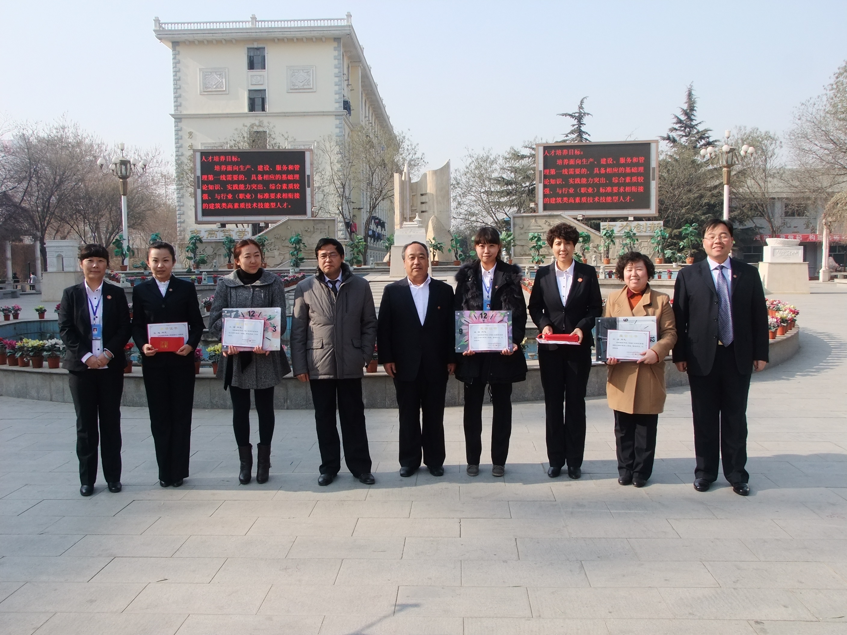 会上,谢钢副院长宣读了《甘肃省教育厅甘肃省文学艺术界联合会关于公布首届大学生摄影大展获奖学生的通知》,王玉平主席宣读了《甘肃建筑职业技术学院关于 表彰首届摄影大赛获奖者的决定》。其中教师组一等奖获得者:王娜,获奖作品《魂》;二等奖获得者:许洁、林瑛,获奖作品分别是《倒映》、《丹霞》;三等奖 获得者:张旭、李雪萍,获奖作品分别是《再别丽江》、《自由驰骋》。参会领导为获奖师生颁发了荣誉证书及奖品。颁奖仪式结束后,高忠有处长宣读了《关于成 立甘肃建筑职业技术学院摄影兴趣小组的批复》。高处长要求摄影兴趣小组以立足校园、服务师生为宗旨,组织全体成员学习摄影知识、探索摄影艺术、开展摄影活 动、进行摄影创作,从而丰富同学们的课余文化生活,提升学生的综合素质,为校园文化建设和甘肃摄影事业发展做出应有的贡献。