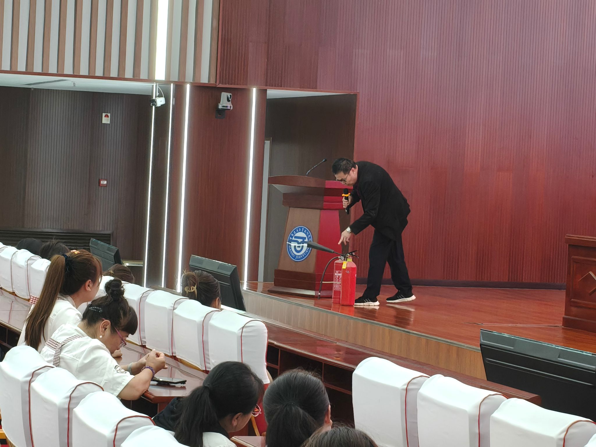 党委安全保卫部 资产经营管理有限公司共同组织开展消防安全培训 日期:2025-08-28 来源: 2025年8月28日10时,学校党委安全保卫部联合资产经营管理有限公司在食堂四楼多功能厅开展了消防安全知识培训,主讲人消防控制室负责人李良杰,食堂200余名工作人员参加培训。培训中李良杰就近三年我校食堂发生火灾事故的情况作了介绍,分析了食堂引起火灾的主要原因,详细阐述了食堂火灾的预防,同时还给大家讲解了灭火器、灭火毯的使用方法和发生火灾时的处理程序等。通过此次讲座,提高了食堂工作人员的消防安全意识,普及了消防常识,初步掌握了消防器材的使用方法。图:秦勇文:秦勇审核:郝昭