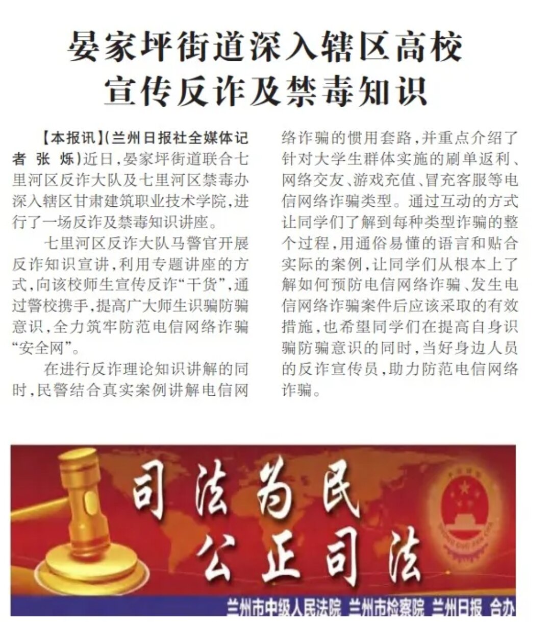为切实加强校园反诈宣传及毒品预防教育,提升在校学生防范电信网络诈骗和识毒、拒毒的能力,3月2日下午,学院联合七里河公安分局、晏家坪街道办事处在学校开展了防范电信诈骗、禁毒专题宣传讲座活动。