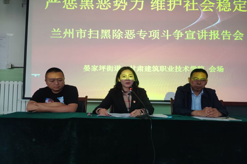 2019年5月23日11:50联合晏家坪街道中院社区,在学院文化广场进行以“开展扫黑除恶专项斗争、创造安全稳定社会环境”为主题的宣传活动,活动中社区与学院保卫处工作人员组织学生进行了问卷调查、发放传单、现场讲解等活动。14:20学院保卫处、宣传部及社区宣传人员,深入学生宿舍进行了宣传、问卷调查及讲解。14:30兰州市扫黑除恶宣讲团领导李琳在晏家坪街道党工委书记杨秉培、晏家坪扫黑除恶专项斗争办公室主任石鑫及学院扫黑除恶办公室成员的陪同下,代表兰州市扫黑除恶专项斗争宣讲团,在我院阶梯一教室为学院师生代表进行了以“严惩黑恶势力、维护社会稳定”为主题的报告会。
