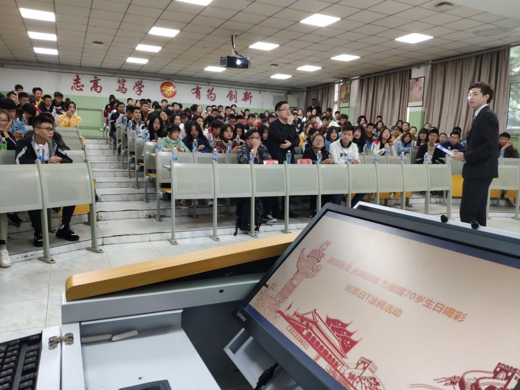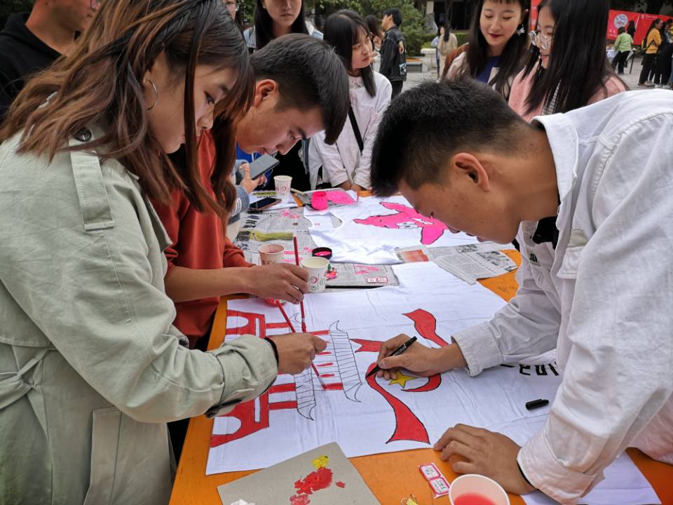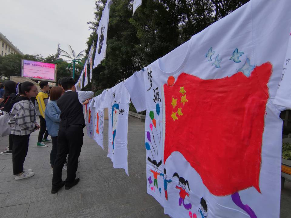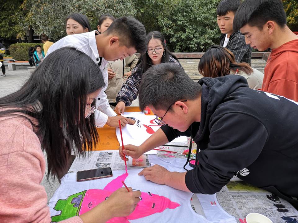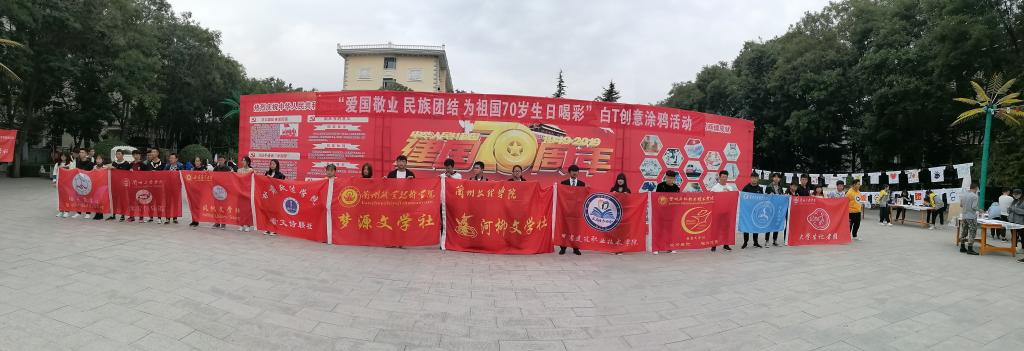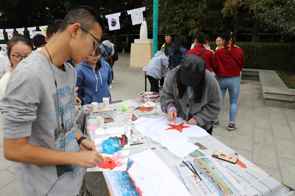 庆祝中华人民共和国成立70周年华诞之际10月13日,由图书馆、团委主办,文启读书协会承办的以“不忘初心、牢记使命,为祖国70岁生日喝彩”为主题的白T创意涂鸦活动在学院风雨广场举办。