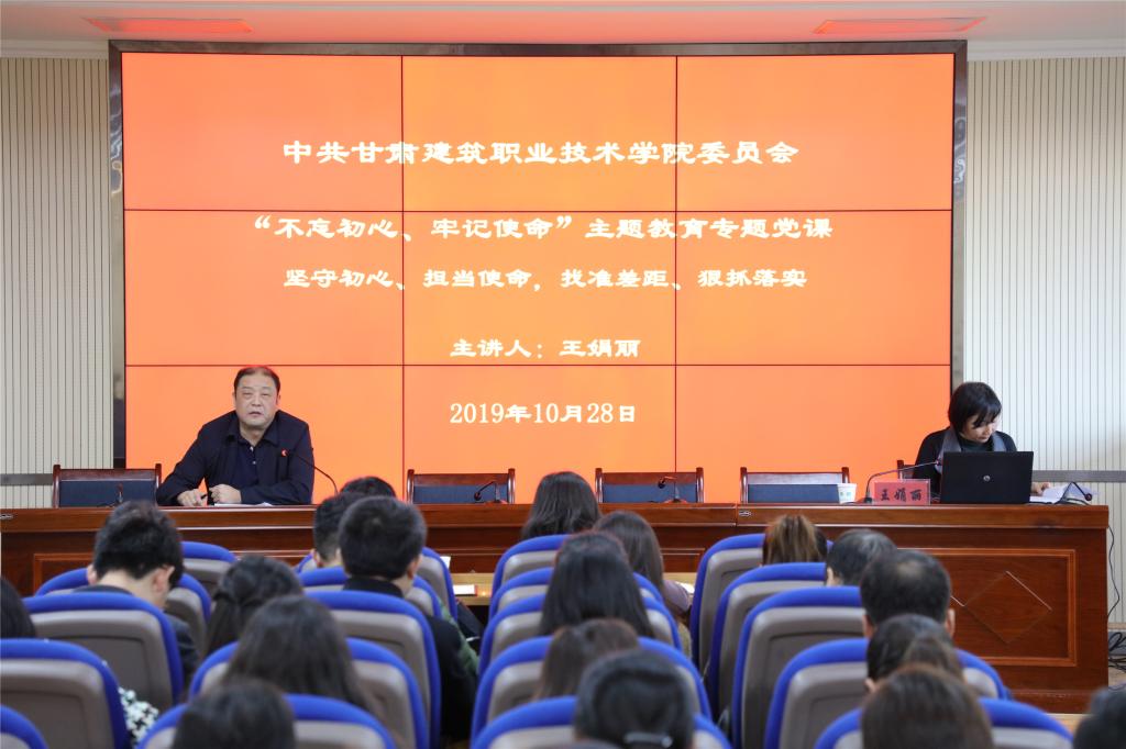 按照《甘肃建筑职业技术学院“不忘初心、牢记使命”主题教育实施方案》的安排,学院党委书记、院长王娟丽在学习教育、调查研究、检视问题、整改落实的过程中,积极实践、深入思考。10月28日,在学院学术报告厅为党员们上了一堂生动的党课。