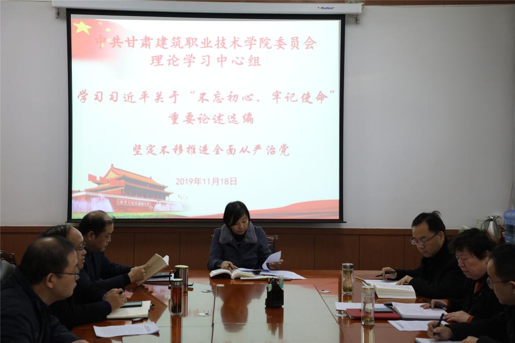 11月18日,甘肃建筑职业技术学院党委理论中心组学习习近平关于“不忘初心、牢记使命”重要论述选编“坚定不移推进全面从严治党”的相关内容。学院党委书记、院长王娟丽及领导班子、中心组成员参加了学习。