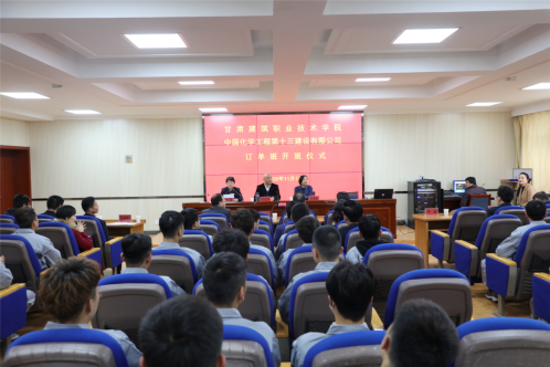 11月17日,甘肃建筑职业技术学院与中国化学工程第十三建设有限公司订单班开班仪式举行。此次订单班共设立3个专业、6个订单班,共计180人,涉及建筑工程系的建筑工程技术、安全技术与管理,环境与市政工程系的建筑设备工程技术专业。开班仪式只是订单班培养的一个重要节点,更是甘肃建院与十三化建校企合作历程的起点,下一步校企双方将积极推进合作办学、合作育人、合作就业、合作发展的体制机制建设,共同制定课程标准、共建课程资源,形成以学校为主、校企合作共同育人的人才培养模式。