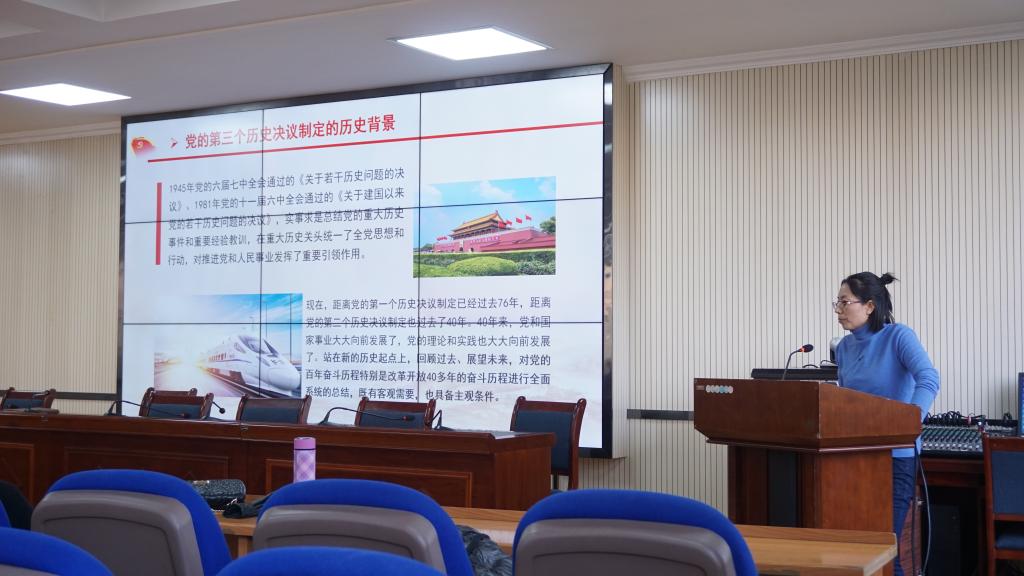 史菊红老师紧紧围绕深刻认识党的十九届六中全会召开的重大意义,深度阐述了党的百年奋斗的光辉历程和辉煌成就,聚焦总结新时代的历史性变革和历史性成就,揭示出党的百年奋斗的历史意义和历史经验,立足现在,以史为鉴开创未来的根本要求等内容进行。