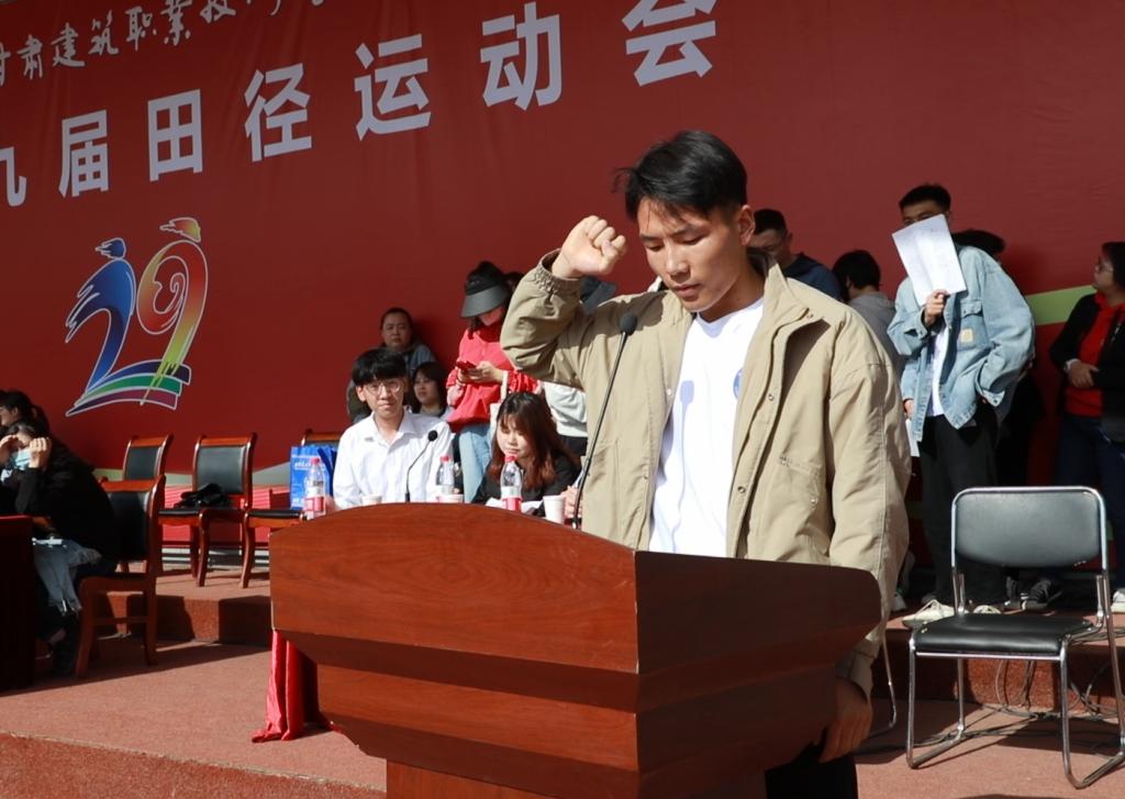 学院体育教研室应文老师代表裁判员宣誓,2021级电子商务班杨海富代表运动员宣誓。