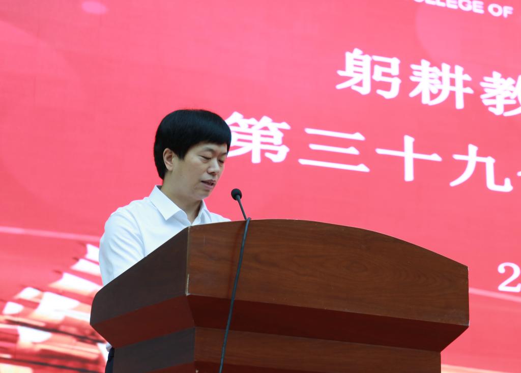 “先进教育工作者”代表孙来忠和大家分享了在教育教学工作中的感受。一是传道授业修德行,争做有品德有思想的教育者;二是团队协作齐奋进,争做有情怀有担当的引路者;三是以赛促教育桃李,争做有理念有学识的授予者;四是创新创业促就业,争做有道德有涵养的实践者。孙来忠老师讲到,在今后的工作中,将拿出百倍的信心和努力,永葆入职初心,勇担教师使命,践行“躬耕教坛、强国有我”,积极投身于学院发展和教育强国建设实践中去。
