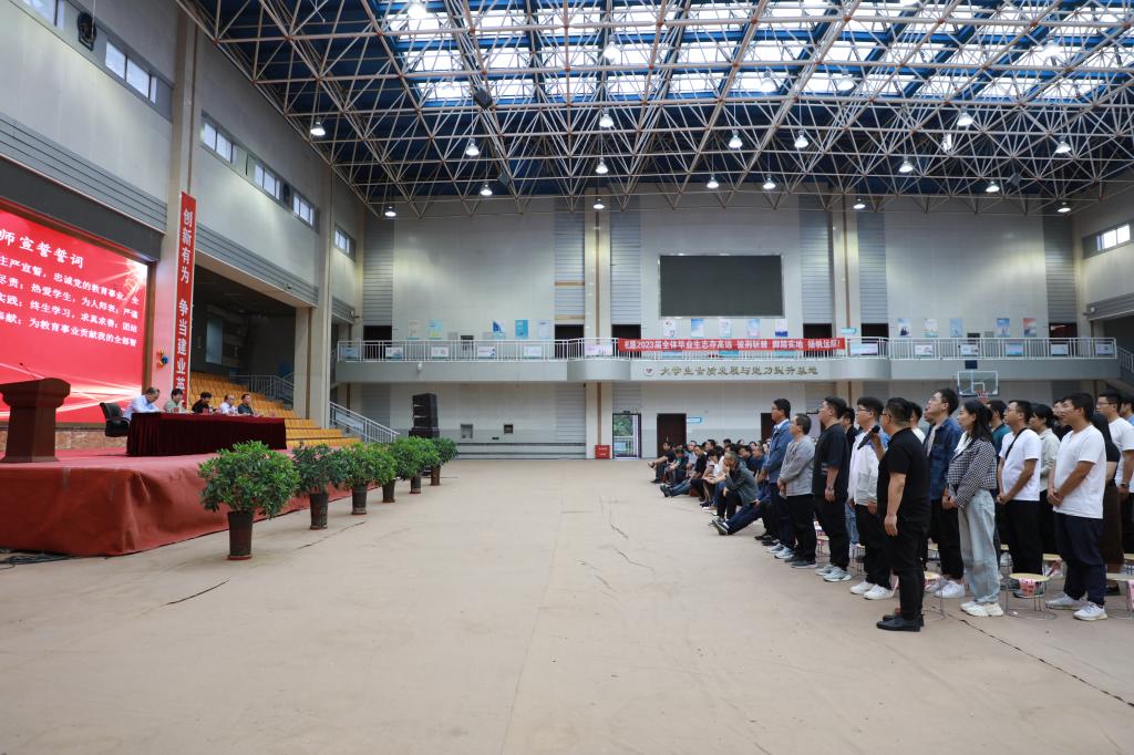 随后,新入职教师在领誓人崔涛的带领下进行了宣誓。表达了将为教育事业贡献全部智慧和力量的坚韧不拔之心。