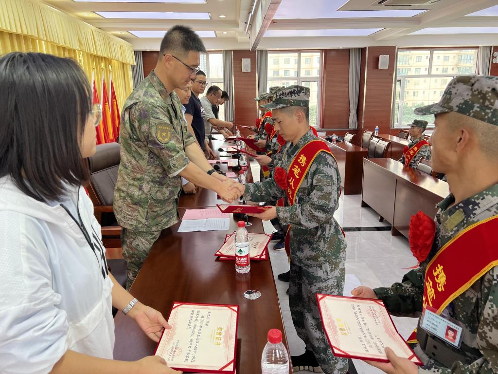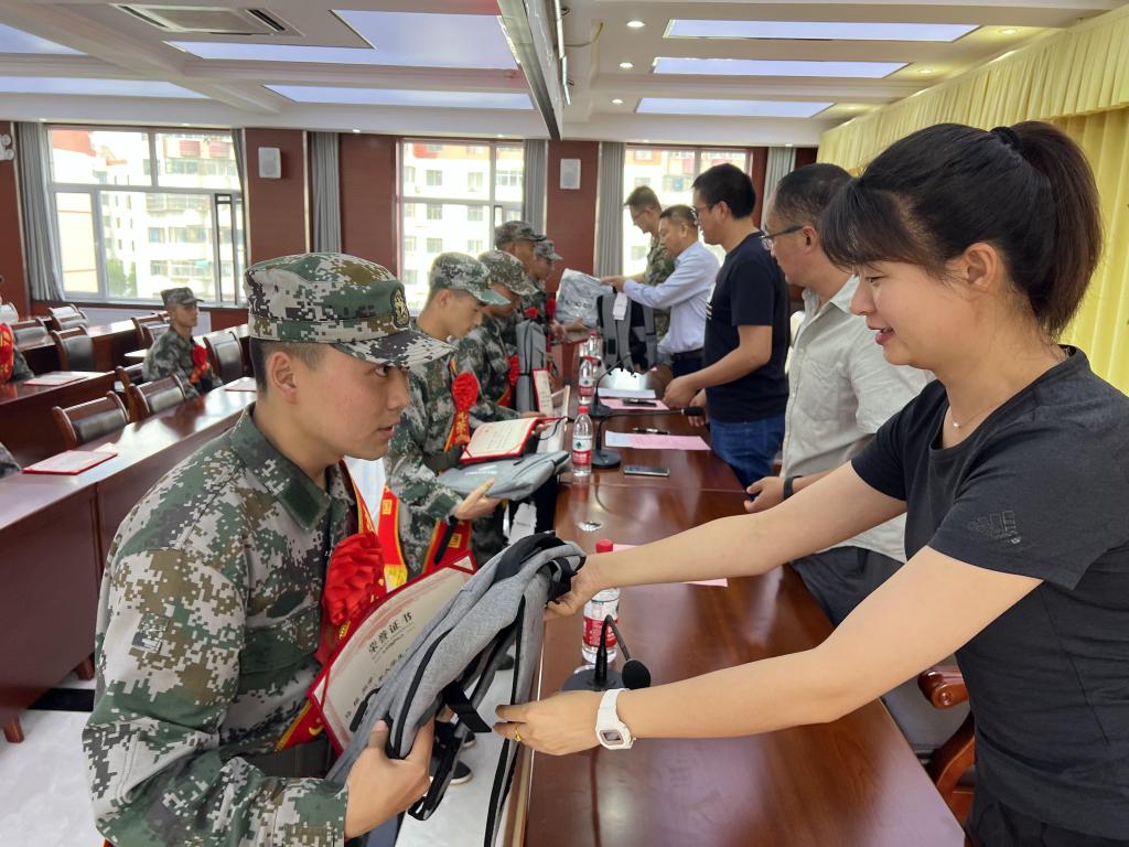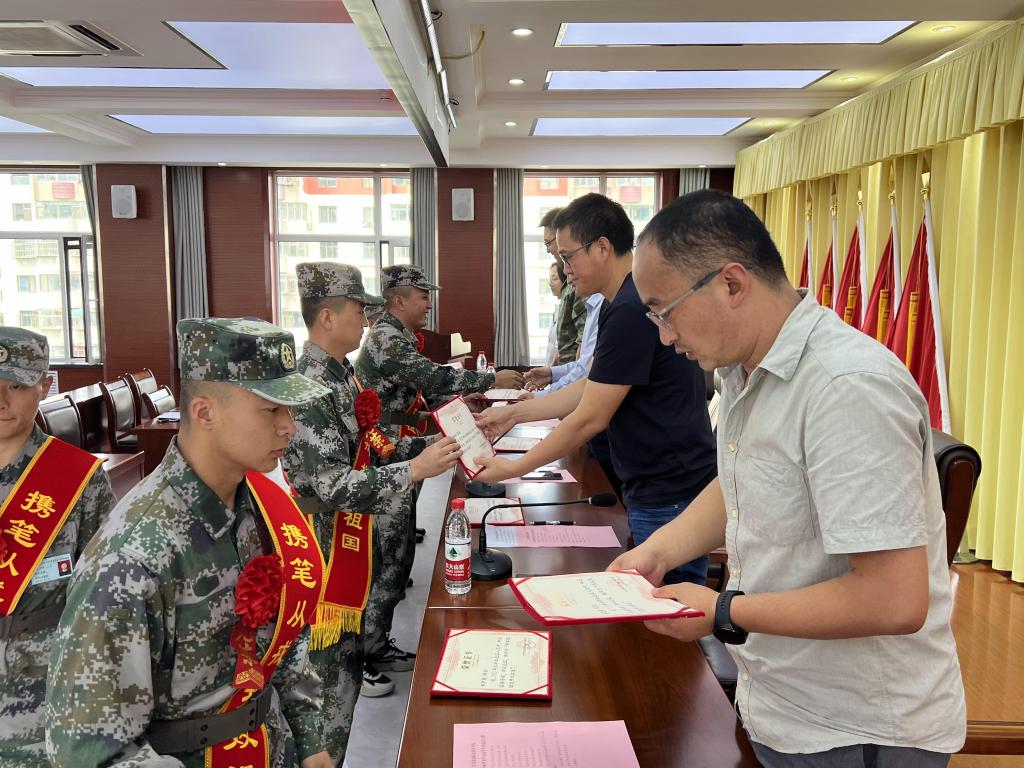 欢送会上,参会领导、老师为17名预定新兵佩戴红花和绶带,颁发“参军报国优秀大学生”荣誉证书、赠送参军纪念品、慰问品,许庆兵同志代表学院向今年秋季应征入伍的同学表示祝贺,并提出嘱托和期望,一要珍惜荣誉,牢记使命。希望同学们始终不忘初心,牢记使命,要不怕困难,不畏艰苦,听从指挥;二要严格锻炼,献身国防。练就过硬本领,锻炼意志品质,使自己成为军队现代化建设的优秀人才。三要建功立业,为家校争光。在部队持续发扬学院爱国奉献的光荣传统,力争早日建功军营,为校添彩。