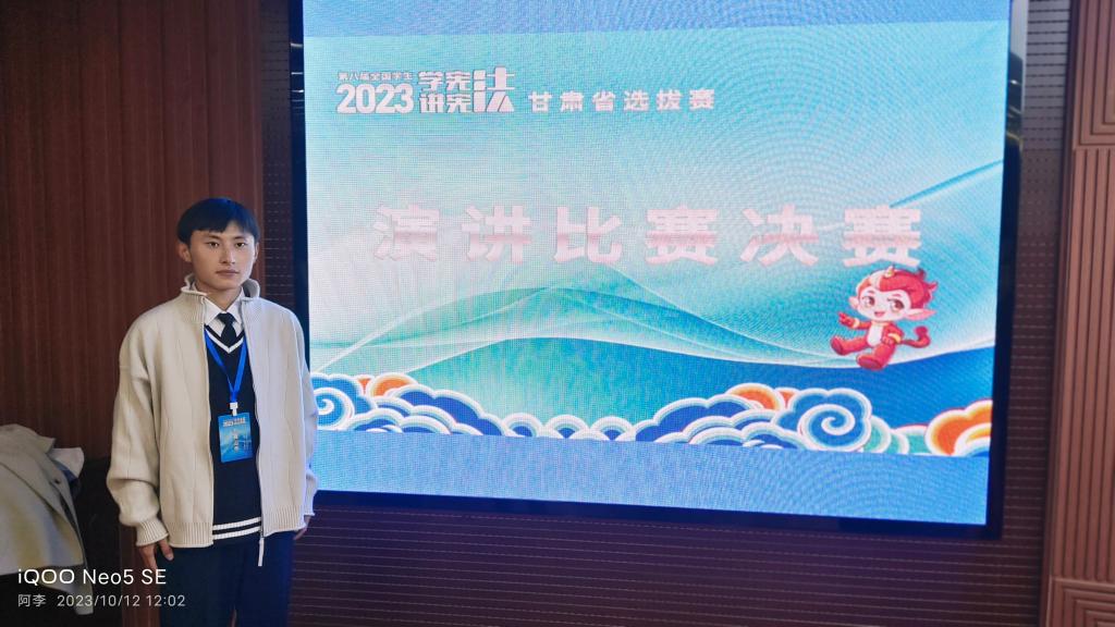 我院学子在第八届全国学生“学宪法、讲宪法”活动甘肃省选拔赛中喜获二等奖 日期:2023-10-12 来源: 10月12日上午,第八届全国学生“学宪法、讲宪法”活动甘肃省选拔赛总决赛在甘肃政法大学举行。我院康越同学在甘肃省演讲比赛总决赛中荣获二等奖。 自秋季学期开学以来,学院组织安排学生积极备赛、刻苦训练,经历了数天的磨砺,来自学院交通工程系的学生康越、魏鹏程、李凯、丁国顺四名同学在演讲比赛和知识竞赛中均表现优秀,其中康越同学在甘肃省演讲比赛总决赛中荣获二等奖,充分展示了建院学子吃苦耐劳、坚忍不拔的精神。在参赛的39所高校中,面对众多本科院校法律专业的激烈竞争,攻坚克难,为校争光。