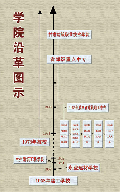 2001年6月,经甘肃省政府批准,甘肃省建筑工程学校、甘肃省建筑职工工程学院、甘肃省建筑职工中专三所院校合并组建甘肃建筑职业技术学院,学院发展步入可持续发展的快车道。